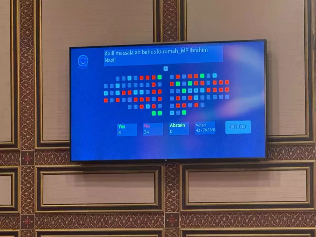 ޕީއެންސީގެ މެޖޯރިޓީ އޮންނަ މަޖިލީހުން މިމައްސަލަ ބޭރުކޮށްލުމަށް 34 މެންބަރުން ވޯޓު ދިން އިރު، ބަހުސް ކުރުމަށް ފެންނަ ވޯޓު ދެއްވީ 8 މެންބަރުންނެވެ.