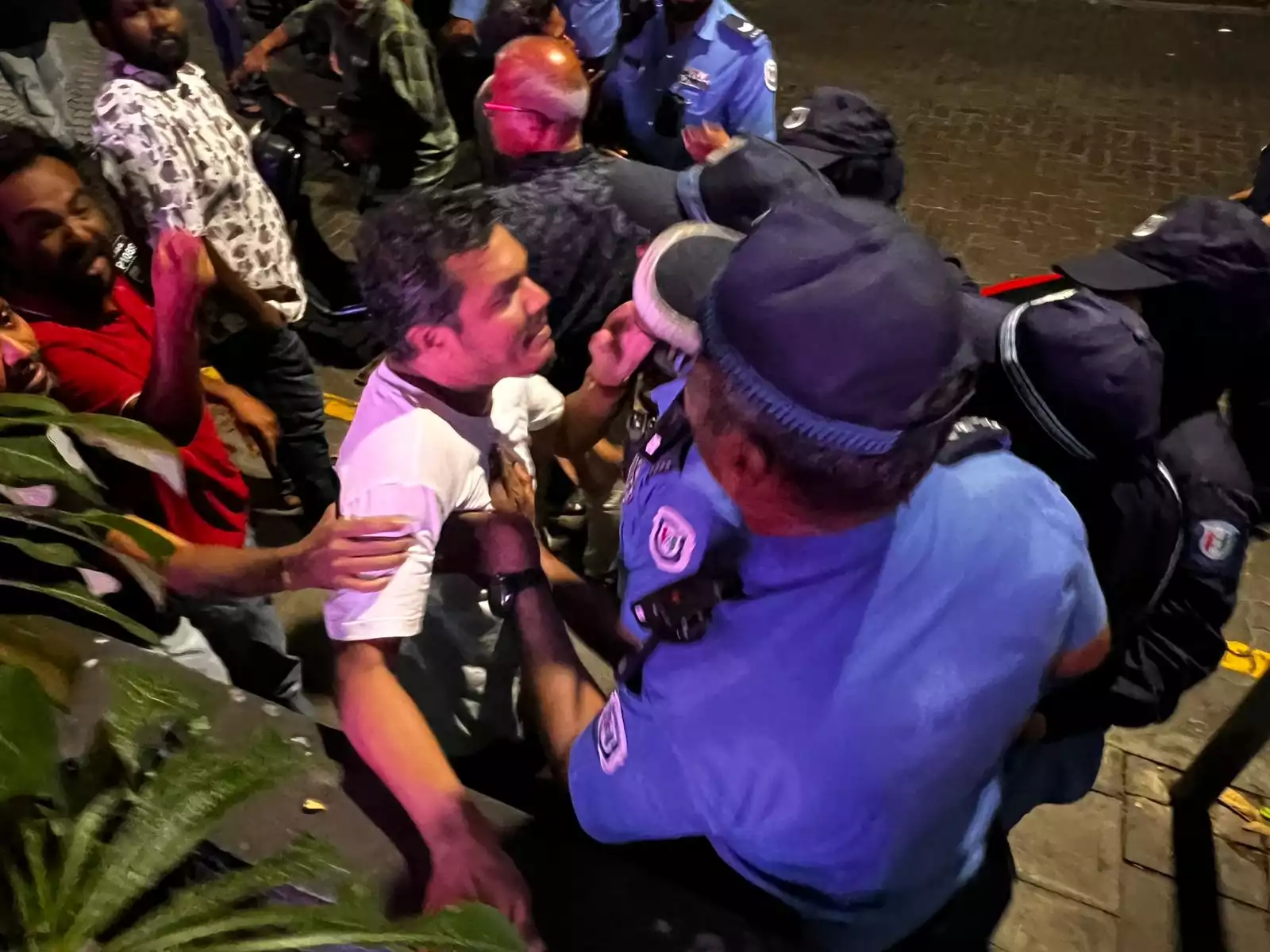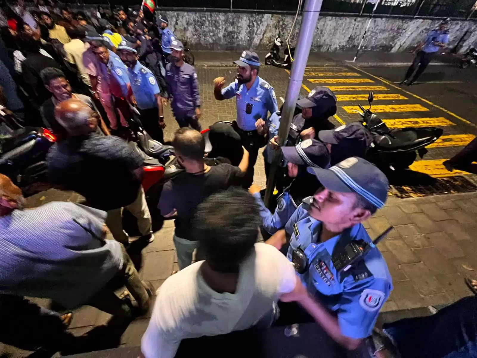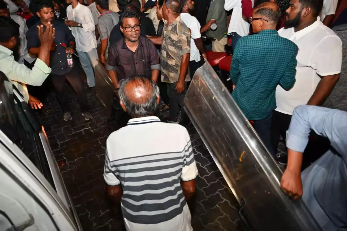 Demonstrators attempting to continue their march through Malé are being physically barred, as authorities hold the line and refuse to let them pass, intensifying the already heated atmosphere on the streets.