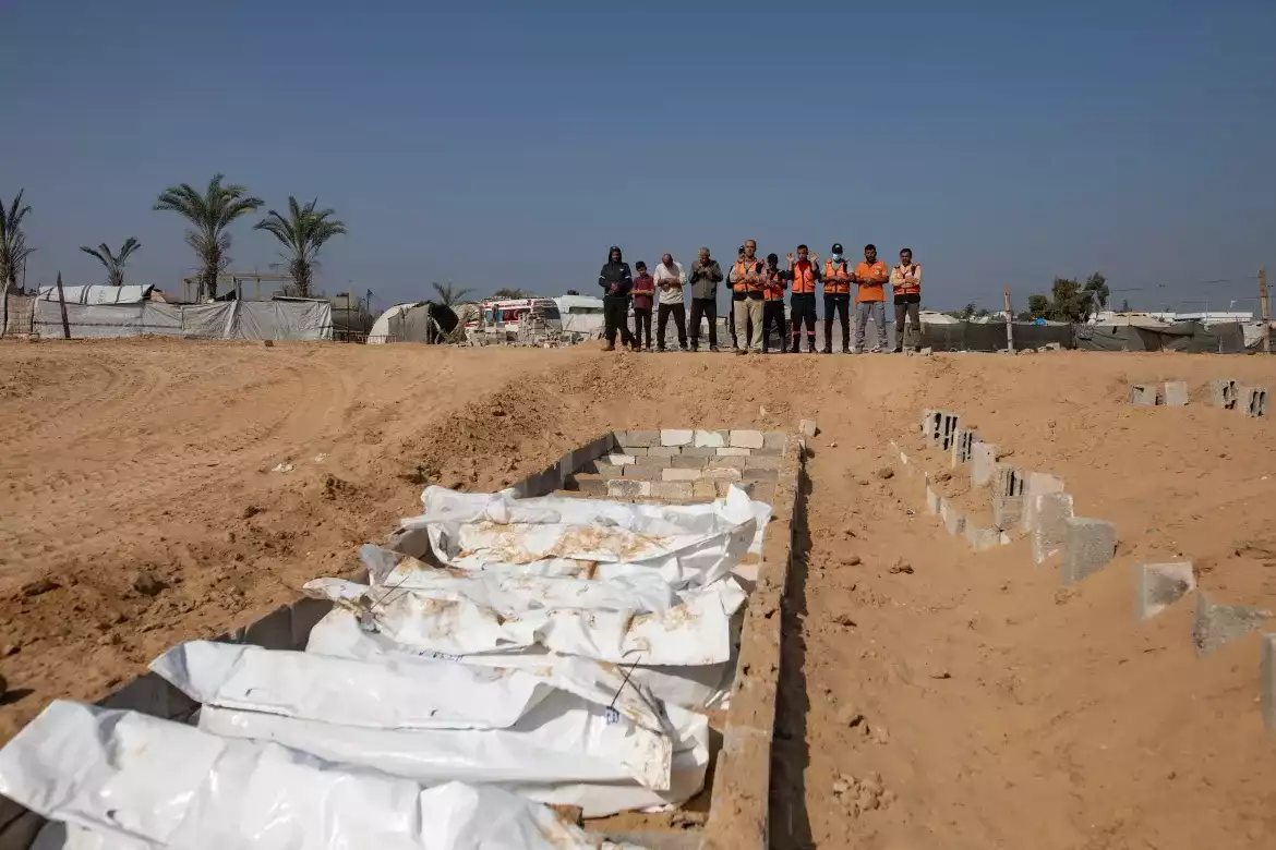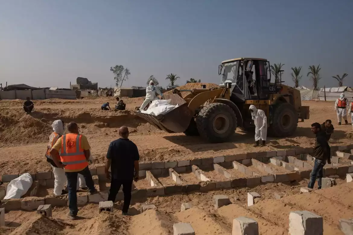 ފަލަސްތީނުގެ ސިވިލް ޑިފެންސްގެ މެމްބަރުން ދީރް އަލް-ބަލާޙުގެ ގަބުރުސްތާނުގައި ހަށިތައް އުފުލަނީ - ފޮޓޯ: އީޕީއޭ