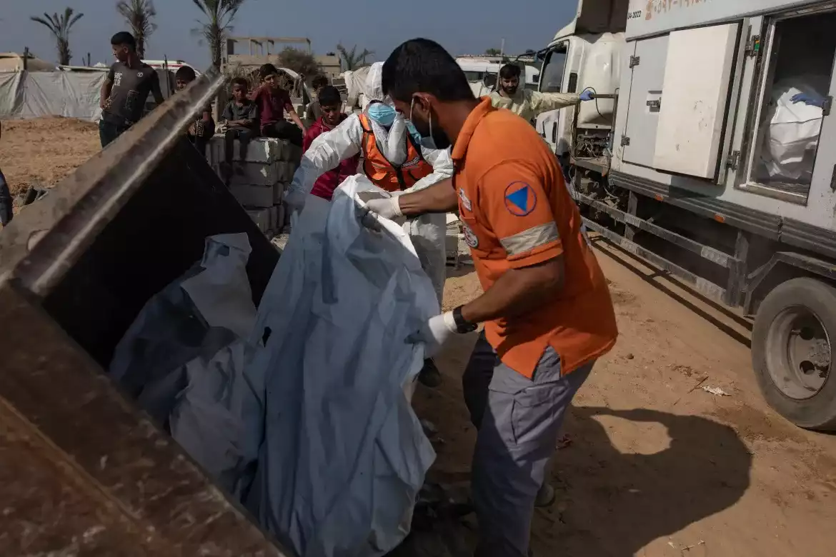 އިޒްރޭލުން އަނބުރާ ފޮނުވާފައިވާ އައިޑެންޓިފައި ނުކުރެވިފައިވާ ފަލަސްތީނުންގެ މީހުންގެ ހަށިގަނޑުތައް، މެދުތެރޭ ގައްޒާގައި ހިމެނޭ ދީރް އަލް-ބަލާޙުގައި ވަޅުލަމުންދާ މަންޒަރު - ފޮޓޯ: އީޕީއޭ